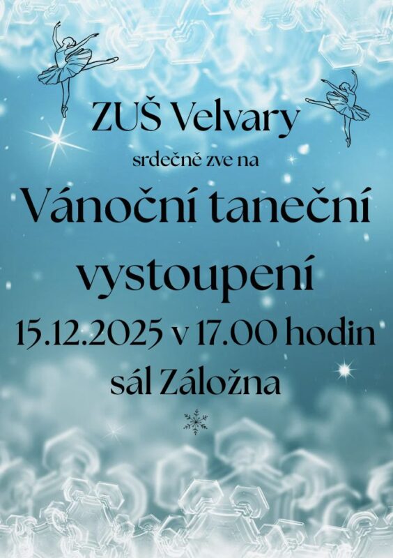 ZUŠ Velvary srdečně zve na Vánoční taneční vystoupení 15.12. 2025 v 17:00 hodin v sále Záložny.